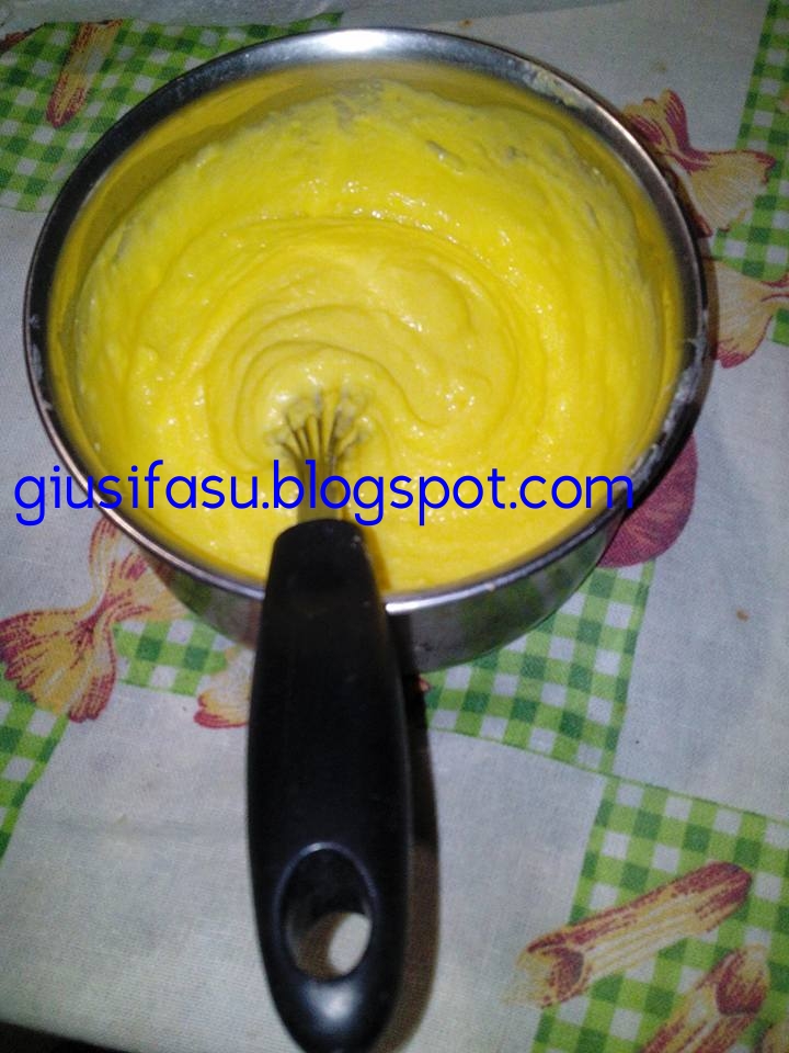 CREMA: 3 uova; 3 cucchiai di zucchero; 3 cucchiai di farina; 3 bicchieri di latte; 1/2 bicchiere d'acqua; 1 limone. GUARNIZIONE: bignè, granella di riso nocciolato; 50 gr di cioccolato fondente; latte.