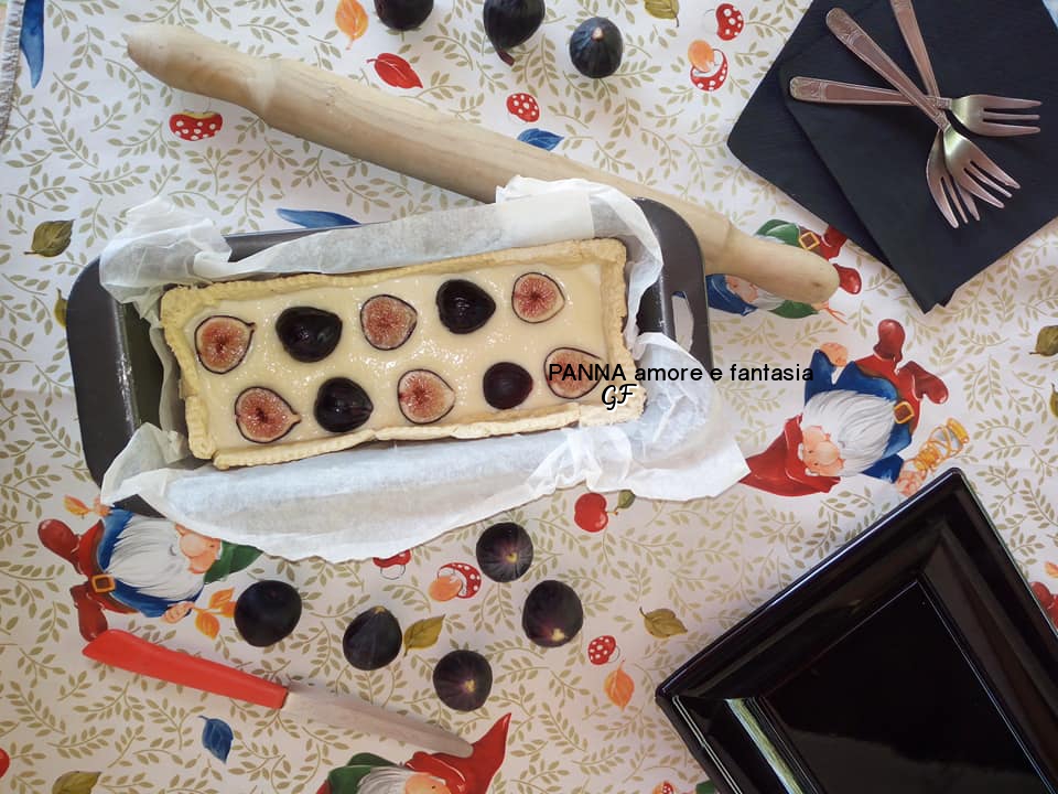 Prepariamo la frolla disponendo la farina a fontana, lo zucchero, il burro morbido a pezzetti, un pizzico di sale, le psezie e l'uovo, cominciamo ad amalgamare con una forchetta e continuiamo a lavorre conle mani infarinate lavorando l'impasto fino ad ottenere un panetto sodo, avvolgiamolo nella pellicola ed infiliamo in frigo per una mezz'oretta; nel frattempo realizziamo la ganache facendo scaldare la panna in un pentolino, uniamo il cioccolato binco spezzettato e facciamolo sciogliere, spegnamo e facciamo raffreddare, io hoinfilato il pentolino in una ciotola colma di acqua fredda,. Tiriamo la frolla fuori dal frigo, stendiamola su un foglio di carta da forno con l'aiuto del mattarello e una manciata di farina, foderiamo con la sfoglia ottenuta e il foglio di carta da forno uno stampo per crostate lungo (io non lo avevo ed ho usato quello da plumcake), ritagliamo la frolla in eccesso, bucherelliamo il fondoo e le pareti con i rebbi di una forchetta, infiliamo in forno caldo a 170° per circa 15 minuti, sforniamo comunque non appena cmincia ad assumere un colorito dorato, una volta fredda farciamola con la ganache e i fichi freschi tagliati a metà, infiliamo in frigo.