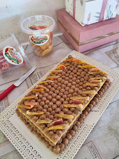 Per il sable' ho ridotto le noci tostate in farina e unite alle altre polveri, la buccia grattugiata del limone, il burro morbido e l'uovo, ho amalgamato velocemente tutti gli ingredienti e lasciato riposare in frigo il panetto avvolto nella pellicola. Nel frattempo per il biscuit ho montato le uova con le fruste elettriche, unito lo zucchero, l'aroma e la farina, ho steso il composto ottenuto sulla leccarda foderata con carta da forno e fatto cuocere a 180° fino a doratura, all'incirca 10 minuti, ho sfornato e lasciato raffreddare. Ho steso il panetto di frolla dandogli una forma rettangolare pari alla metà del biscuit che taglierò in 2 parti ed infilato in forno per 10/12 minuti a 180°. Mentre le basi raffreddano ho preparato il pralinato: ho realizzato un caramello semplicemente versando lo zucchero in una padella antiaderente a fuoco basso senza mescolare, una volta sciolto l'ho versato sulla frutta secca che avevo sistemato su un foglio di carta forno e ho lasciato indurire. Per la crema mousseline ho proceduto come una classica crema pasticcera, unendo, una volta raggiunto il bollore, il burro a pezzetti. Ho passato nel mixer il pralinato fino ad ottenere una farina, se avete un mixer potente continuando a frullare otterrete un composto morbido e denso che ho aggiunto alla crema. Una volta raffreddate tutte le preparazioni ho assemblato il dolce. Ho posizionato sul vassoio il sable', ho steso un velo di confettura di fichi fatta in casa, ho adagiato un primo strato di biscuit, su di esso ho distribuito la crema mousseline al pralinato in tanti ciuffetti con l'aiuto di una siringa per dolci, ho proceduto col secondo biscuit ed altri ciuffetti di crema fino a ricoprire la mattonella, ho guarnito con striscioline di papaya e mango disidratati per dare un po' di colore.